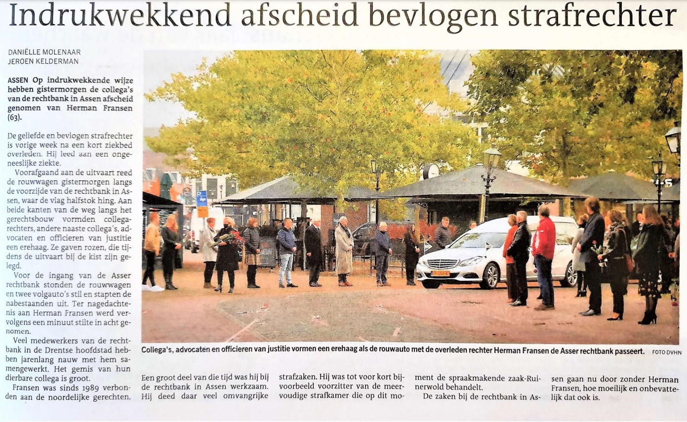 Op indrukwekkende wijze hebben collega’s van de rechtbank in Assen dinsdagochtend afscheid genomen van Herman Fransen (63). De geliefde en bevlogen strafrechter overleed vorige week na een kort ziekbed aan een ongeneeslijke ziekte.